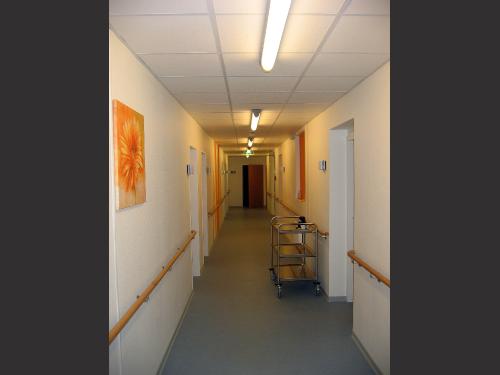 Zwei gartenseitige Neubauten, die in wohngruppenähnlicher Organisation 32 Pflegezimmer für gerontologische Psychiatrie und neurologische Pflege umfassen, sind bereits fertig gestellt. Ein Bewegungsgang verbindet diese und umschließt gleichzeitig den Sinnesgarten.